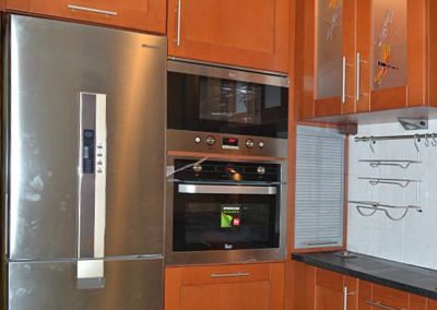 | Meble kuchenne drewniane w stylu klasycznym. Piekarnik i kuchenka mikrofalowa są powyżej blatu. | |