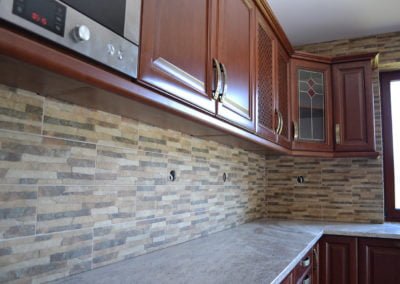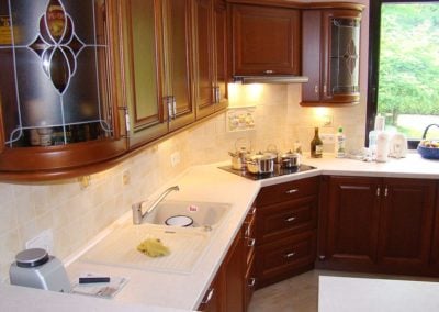 | Kuchnia klasyczna z frontami drewnianymi orzech w wybarwieniu czereśnia i z blatami kamiennymi kashmir white. Uchwyty mosiężne i barwione witraże są ciekawym wykończeniem szafek. | |
