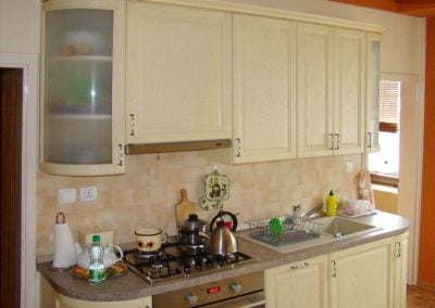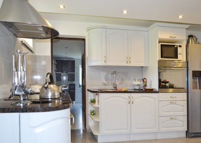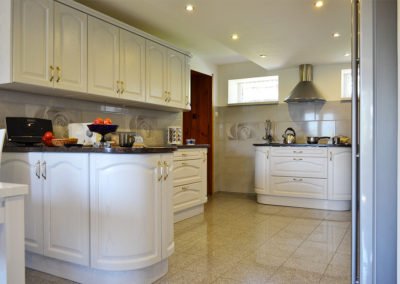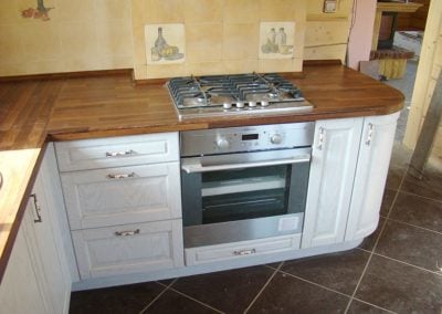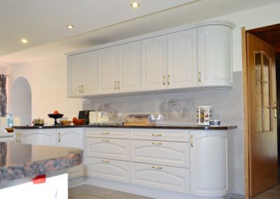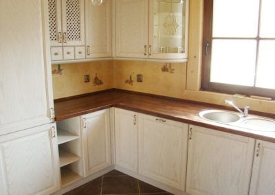| Kuchnię tą wykonano z frontami drewnianymi dębowymi barwionymi na biało oraz z blatami granitowymi tan brown. Uchwyty mosiężne ze wstawkami porcelany oraz fronty półokrągłe stanowią typowe wykończenie w meblach kuchennych tradycyjnych. | |