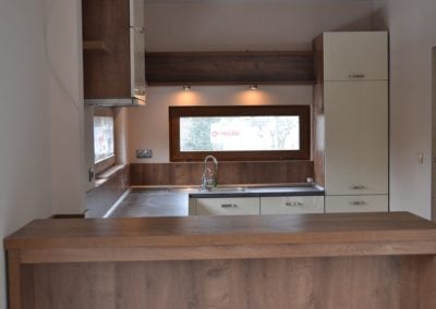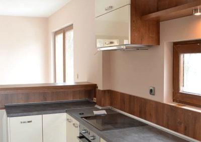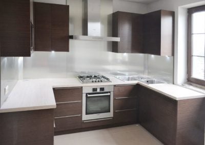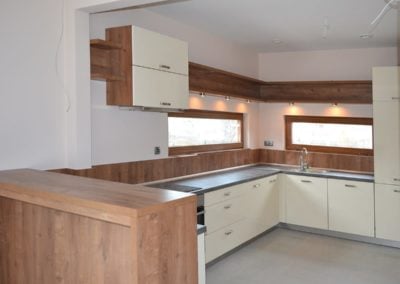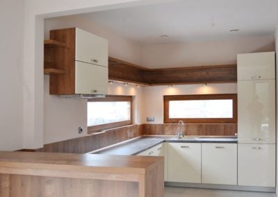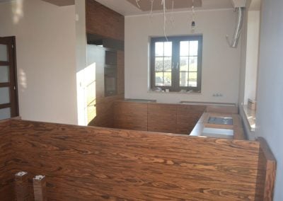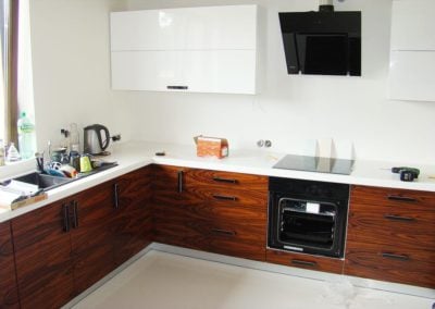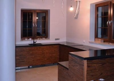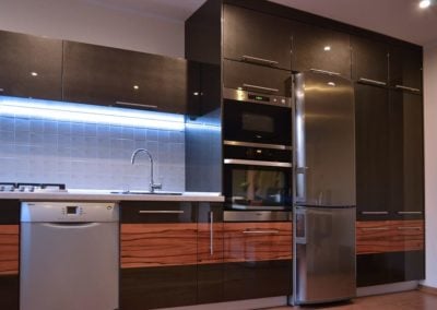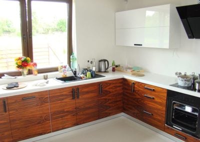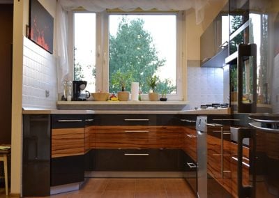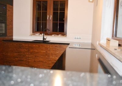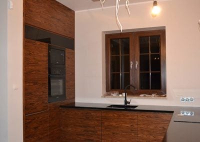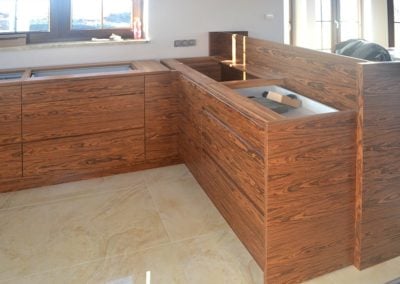| Kuchnia nowoczesna w połysku z blatami i bokami widocznymi mebli fornirowanymi. Część ścian jest też fornirowana. | |