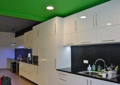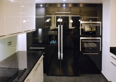 | Kuchnia nowoczesna z frontami prostymi lakierowanymi na wysoki połysk; większość frontów to biały połysk a szafy wysokie to czarny połysk. Na jednej ścianie widać wstawkę z zielonego szkła lacobel. Szkło jest oświetlone ledami. Na szafki zostały nałożone czarne blaty granitowe star galaxy złoty, na murek został nadbudowany blat dębowy lakierowany. Na jednym ze zdjęć widać zlew podwieszany pod blat. Ściany częściowo zostały wykończone granitem. Montaż w Luksemburgu był robiony na podstawie pomiaru i zdjęć pomieszczenia przesłanych przez klienta. | |