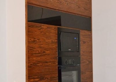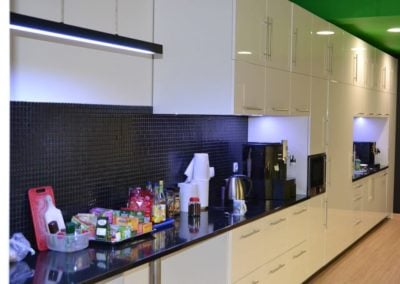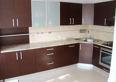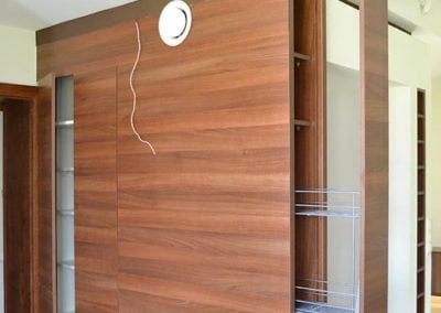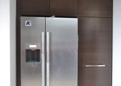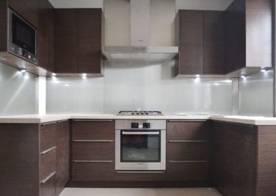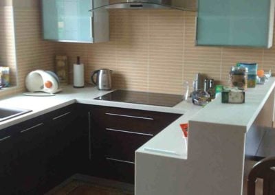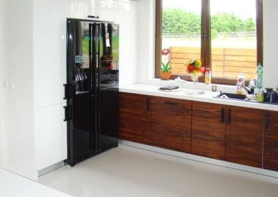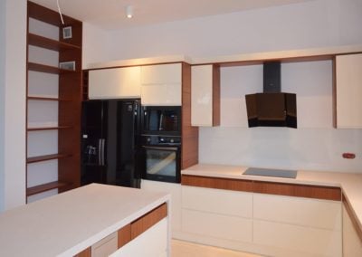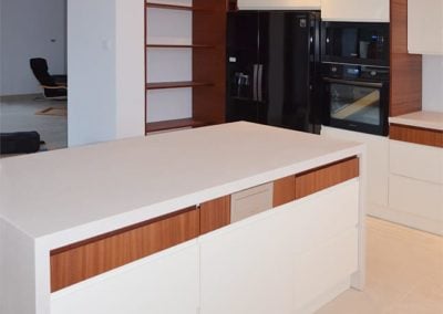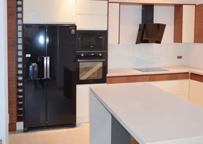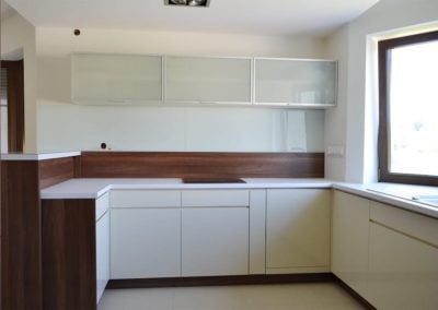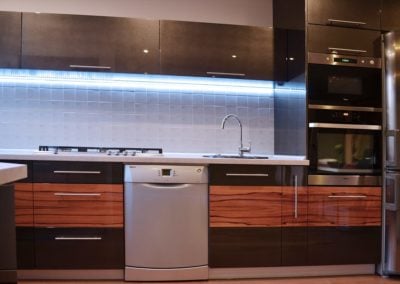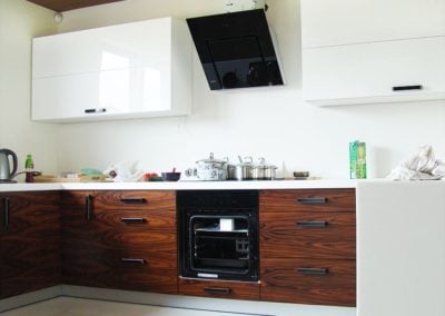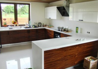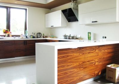 | Fronty szafek dolnych wykonane z forniru palisander, fronty górnych w białym lakierze połysku. Blaty wykonane z Corianu. Tylna część blatu podświetlana od wewnątrz. | |