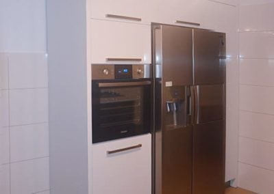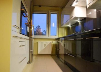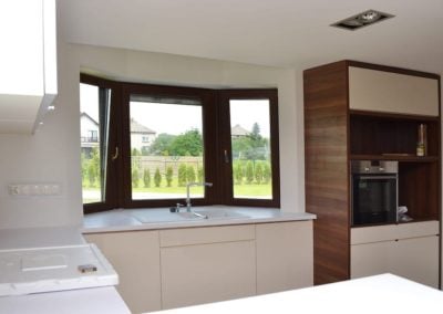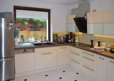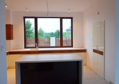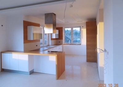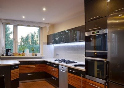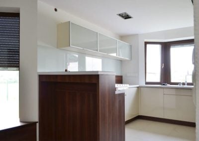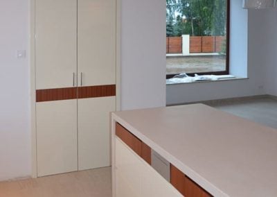 | Kuchnia z frontami w beżowym lakierze połyskowym z dodatkami forniru (fornir dębowy barwiony na czerwono). Jasne blaty Corian wchodzą na okno zastępując parapet. Do kuchni dobudowano regały fornirowane. | |
