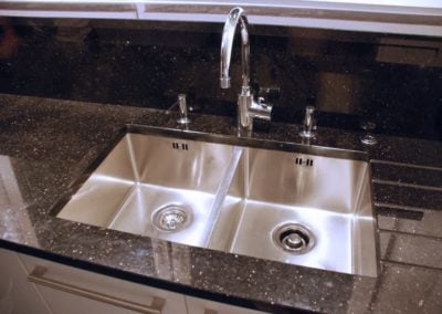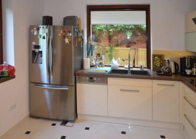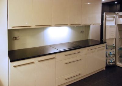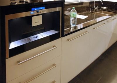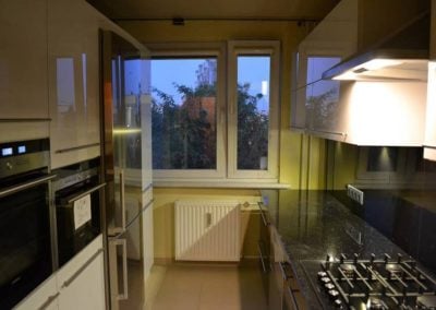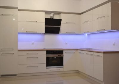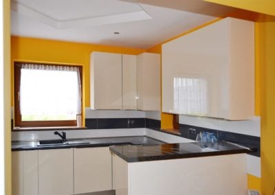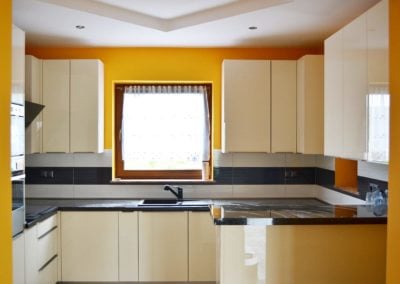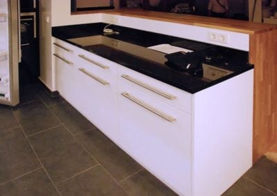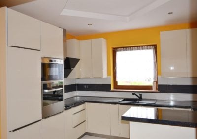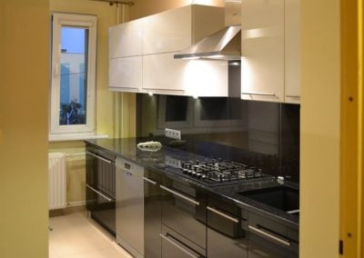 | Meble z frontami w białym lakierze wysoki połysk i z blatami granitowymi nero połysk. | |