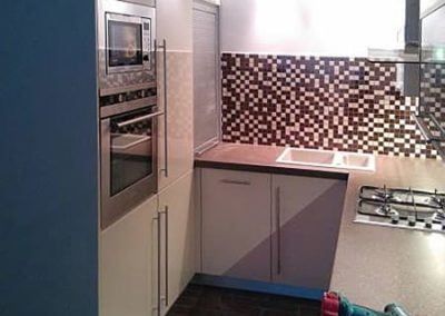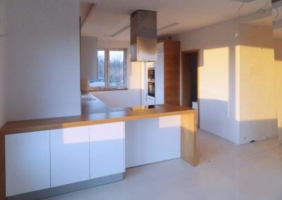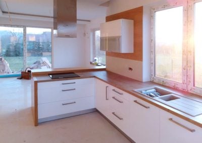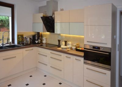 | Meble kuchenne w połysku z blatem dębowym. | |