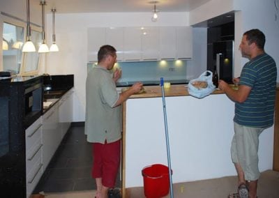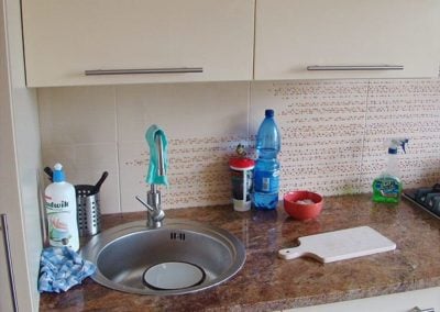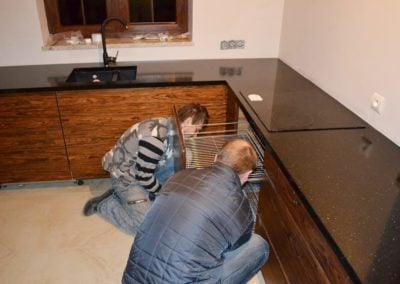 | Zdjęcia wykonano podczas końcówki montażu kuchni w Czechowicach na ulicy Żbika. Widać meble przed oraz po położeniu blatów. Fronty tej kuchni to mdf fornirowany palisander z usłojeniem przechodzącym. Blaty to 3cm granit star galaxy złoty. | |