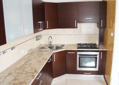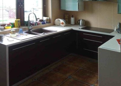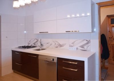 | Fronty mebli są lakierowane w brązowym i białym połysku. Blat Corian. | |
