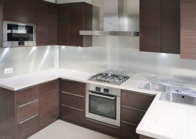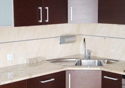 | Meble kuchenne fornirowane orzechem wg symbolu 1001 z blatami laminowanymi Pfleiderer serii Unico Pico 8995 38mm (łączenia blatów na wcinkach). Zastosowano uchwyty listwowe UKW11 inox. Na ściany założono płytę pokrytą powłoką ze stali szlachetnej (inox). | |