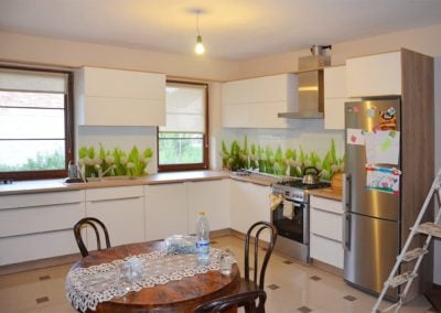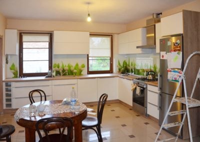| Fronty kuchni wykonano z płyty laminowanej białej firmy Egger. Na ścianę wstawiono szkło laminowane połyskowe o wzorze zielono-waniliowych kwiatów. | |