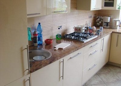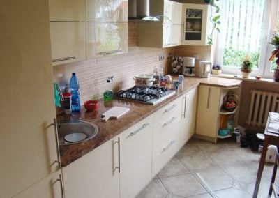| Kuchnia na wymiar z frontami beżowymi na wysoki połysk. Zastosowano fronty mdf z powłoką akryluxu, blaty laminowane ciemne oraz wykończenia (półki, boki szafek) laminowane Kronopol dąb antyczny. | |