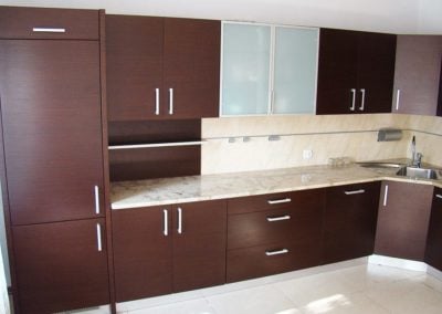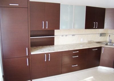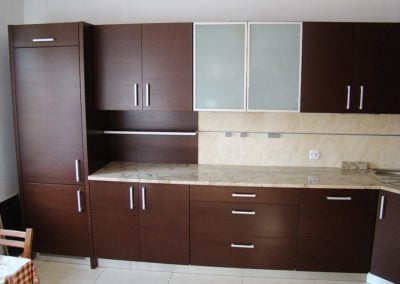 | Meble kuchenne z blatem kamiennym marmurowym oraz z frontami naturalnymi Wenge. Aluminiowe dodatki oraz pogrubiane boki osłonowe przy lodówce harmonizują kompozycję. | |