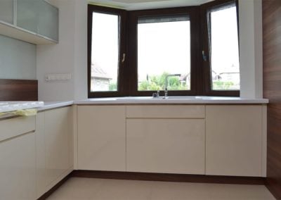 | Kuchnia na wymiar z frontami lakierowanymi w beżowym połysku oraz z bokami widocznymi orzech aida tabak. Część frontów to ramki aluminiowe ze szkłem mlecznym, blaty są laminowane firmy Egger. Uchwyty frontów zostały nafrezowane w płycie mdf, po czym zalakierowane. | |